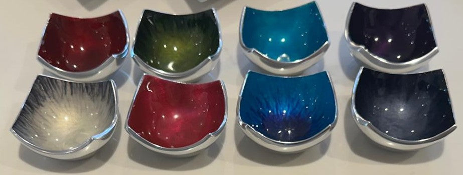 Size: L 6 cm Tilnar Art is very proud to have designed our new Aluminium Mini Coloured Dishes. They are Fair Trade and hand made by Indian artisans. The products are made from recycled aluminium. The products are cast, then rough polished and enamelled before being beautifully finished with a smooth...